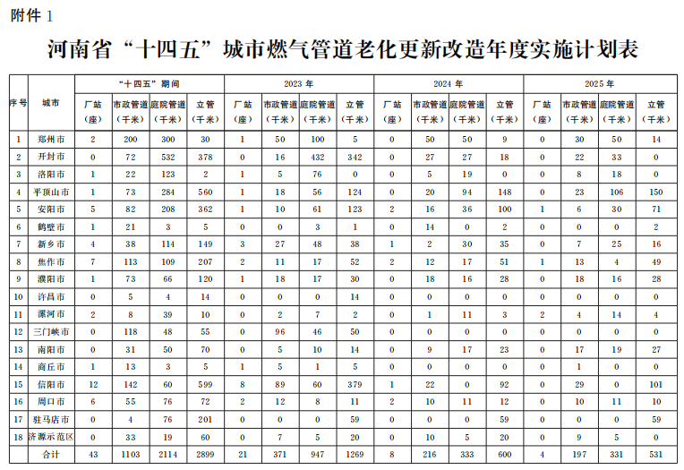 附件:1.河南省“十四五”城市燃气管道老化更新改造年度实施计划表